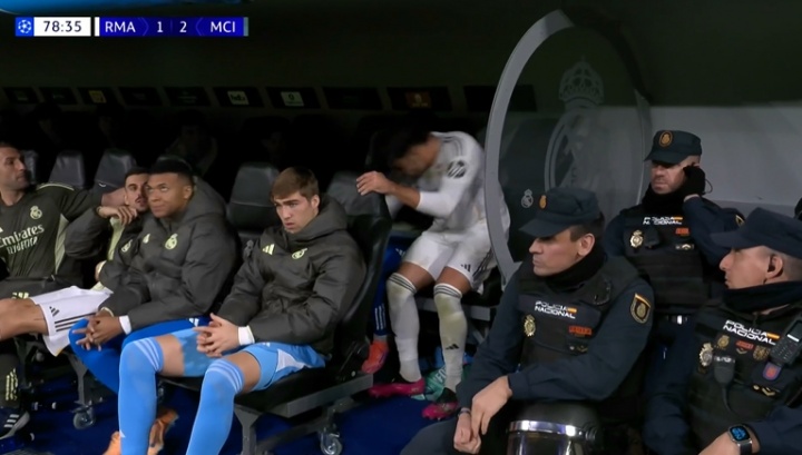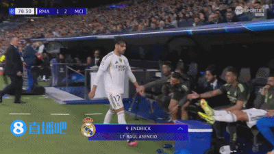 直播吧12月11日讯 欧冠联赛阶段第6轮,皇马对阵曼城。79分钟,皇马用恩德里克换下阿森西奥,皇马用完换人次数,姆巴佩无缘出场。